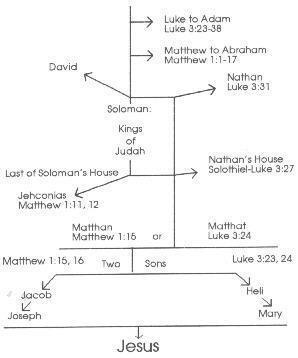 NOTE (at the side of chart): Matthew comes down from Abraham to David, to Solomon, through Judah to Jeconias or Coniah (where the Solomonic line was cut off—Jeremiah 22:28-30). The legal line then passed over to the bloodline in the house of Nathan in the person of Salothiel or Shealtiel. Luke goes from Mary to Heli, then to Nathan, and then crosses to David and on to Adam. Thus he leaves Solomon and the reigning line of kings out. NOTE (under chart): (1) Heli's male heir was his brother Jacob and Jacob's male heir was his own son Joseph. This made Joseph the legal heir to the Levitic throne. Then Heli's blood descent was Mary and Mary's first born son was Jesus. Thus Jesus was blood heir and legal heir. Joseph and Mary were cousins with a common grandfather, Matthat or Matthan. The Targum agrees with this. (2) In Matthew's genealogy there were four women mentioned. All four went off the beaten path. There was Tamar. The men of the place said there was no harlot there but Tamar did go off the beaten path. There was Rahab, who is called the harlot, yet who married Solomon and thus entered the Messianic line. There was Ruth whose reputation was above reproach. Yet she crossed the accepted standard of conduct. It was only her unstained record that saved her reputation. Then there was Bath-Sheba whose past record was unstained but who definitely crossed the ethical standards of the day. They are mentioned, as they were all unusual in some manner. The ethics of their day would clear Tamar and possibly Ruth, but not Bath-Sheba exactly. Rahab is in the fog of heathenism and was probably as guiltless as the others if the truth is known. PART II ANNOUNCEMENT AND INTRODUCTION